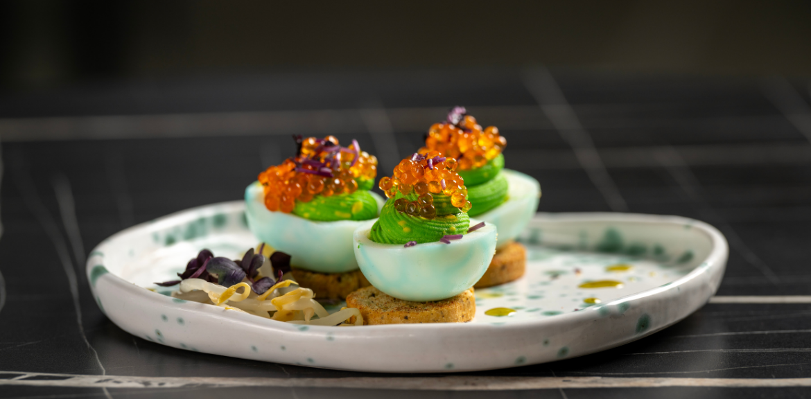 Pipe the avocado cream into each egg white half, creating a neat swirl. Top each with a generous amount of Delica Caviar for a luxurious touch.