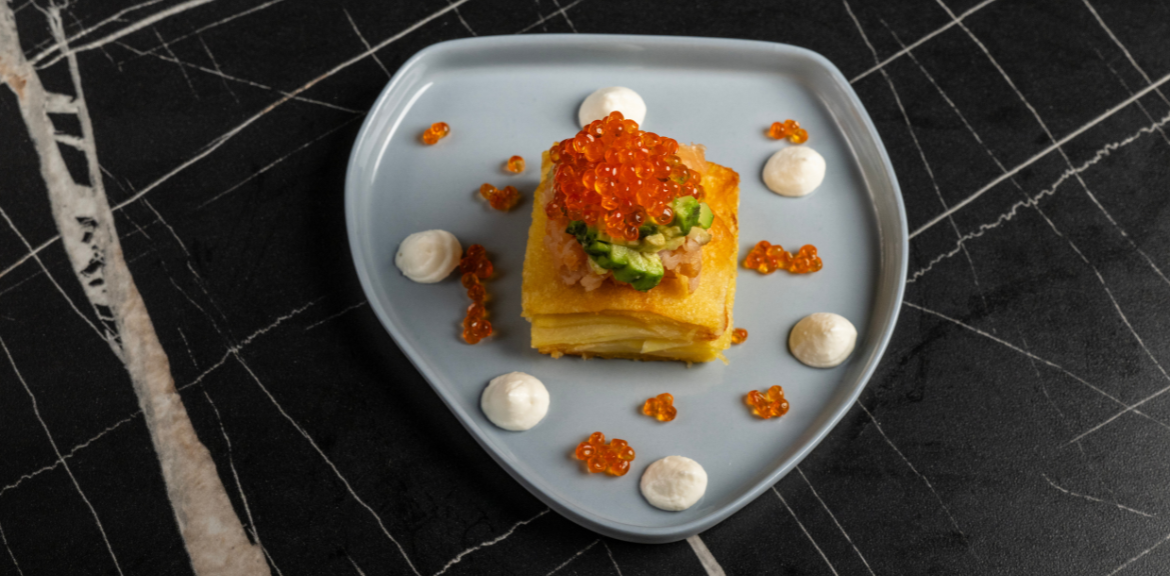 Potato Mille-Feuille with Delica Caviar and Smoked Salmon