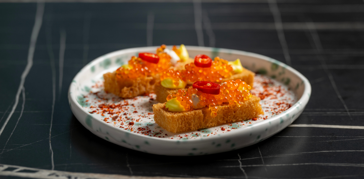 These toast bites combine the creamy and tangy flavors of the base with the luxurious pop of Delica Caviar and a spicy twist from the chili peppers, creating a gourmet snack or party dish. Enjoy!