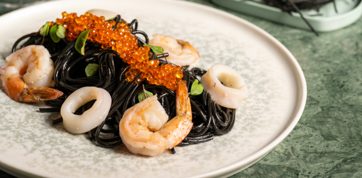 Squid Ink Pasta with Shrimp, Calamari, and Delica Caviar